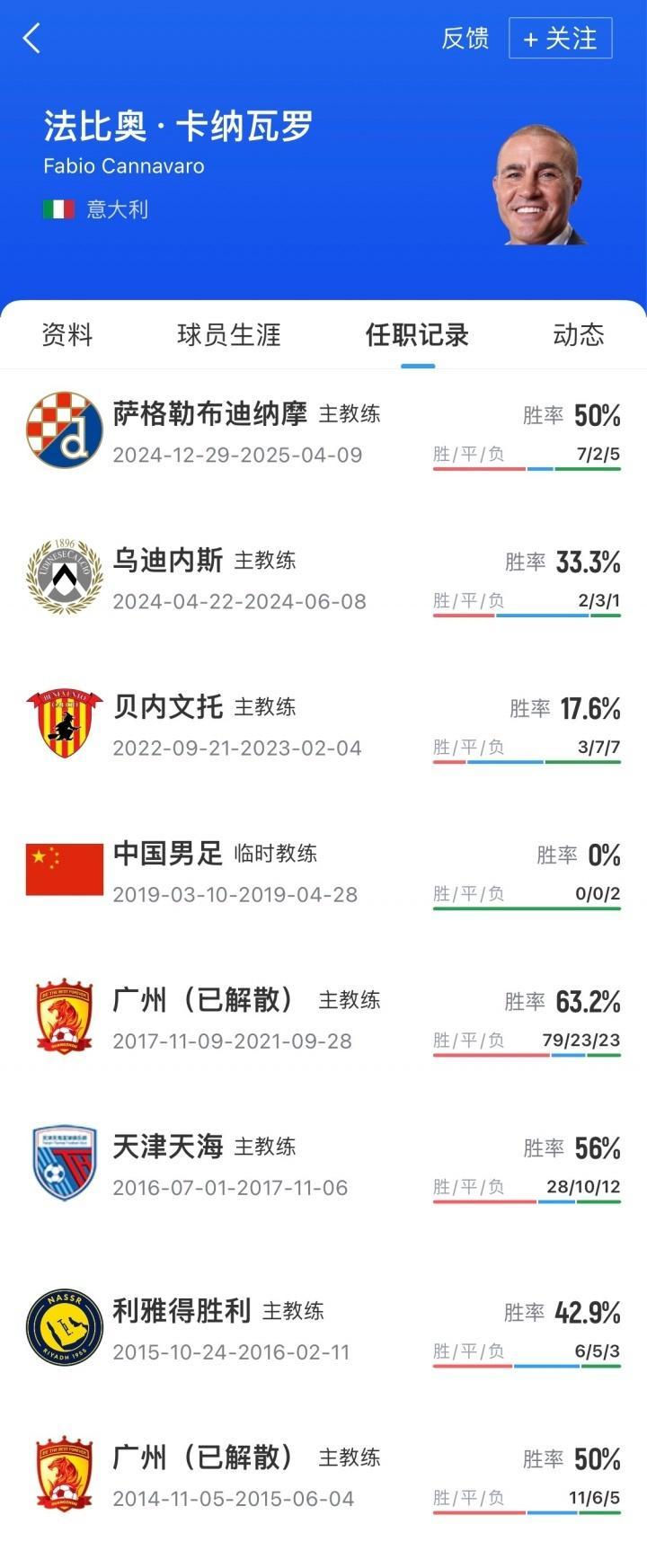 问题是好的球员并不一定是好的教练,虽然卡纳瓦罗从年纪上只有51岁,符合了国足找新教练的要求,可是他8段教练履历当中,却并没有取得过太过耀眼的成绩。最好的成绩是当初先在广州队当主教练,后面去了利雅得胜利队,天津天海队,接下来在广州恒大队算是达到了执教生涯的顶峰,拿到了63.2%的胜率,但也仅限于此了。
