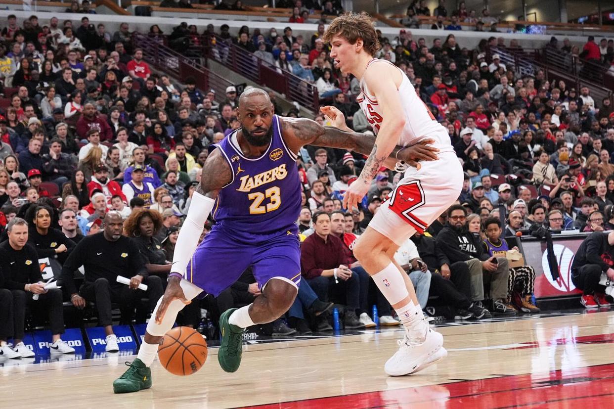 东契奇中投得分,武切维奇补篮打进,詹姆斯连续单打不进,八村塁大帽怀特。道苏姆罚进1球,斯马特2罚全中,芝加哥请求暂停。东契奇轰进三分球,湖人稳住局面,怀特外线取分,雷迪克请求暂停。詹姆斯助攻东契奇轰进远投,海斯抢断吉迪后完成胯下大风车暴扣,湖人领先14分锁定大局。