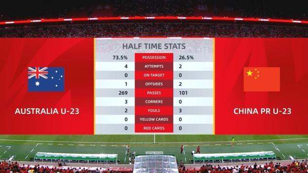 上半场,澳大利亚U23队尽管控球率高达73.5%,但面对中国U23队摆出的铁桶阵,也没有太好的拆解办法。澳大利亚U23队上半场射门次数以4比2落后,但没有收获射正球门的绝对机会,双方在45分钟后交出0比0的答卷。