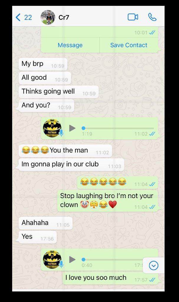 埃弗拉晒出了他与C罗的一段聊天记录。C罗对他说:“我要在我们的俱乐部踢球了!”